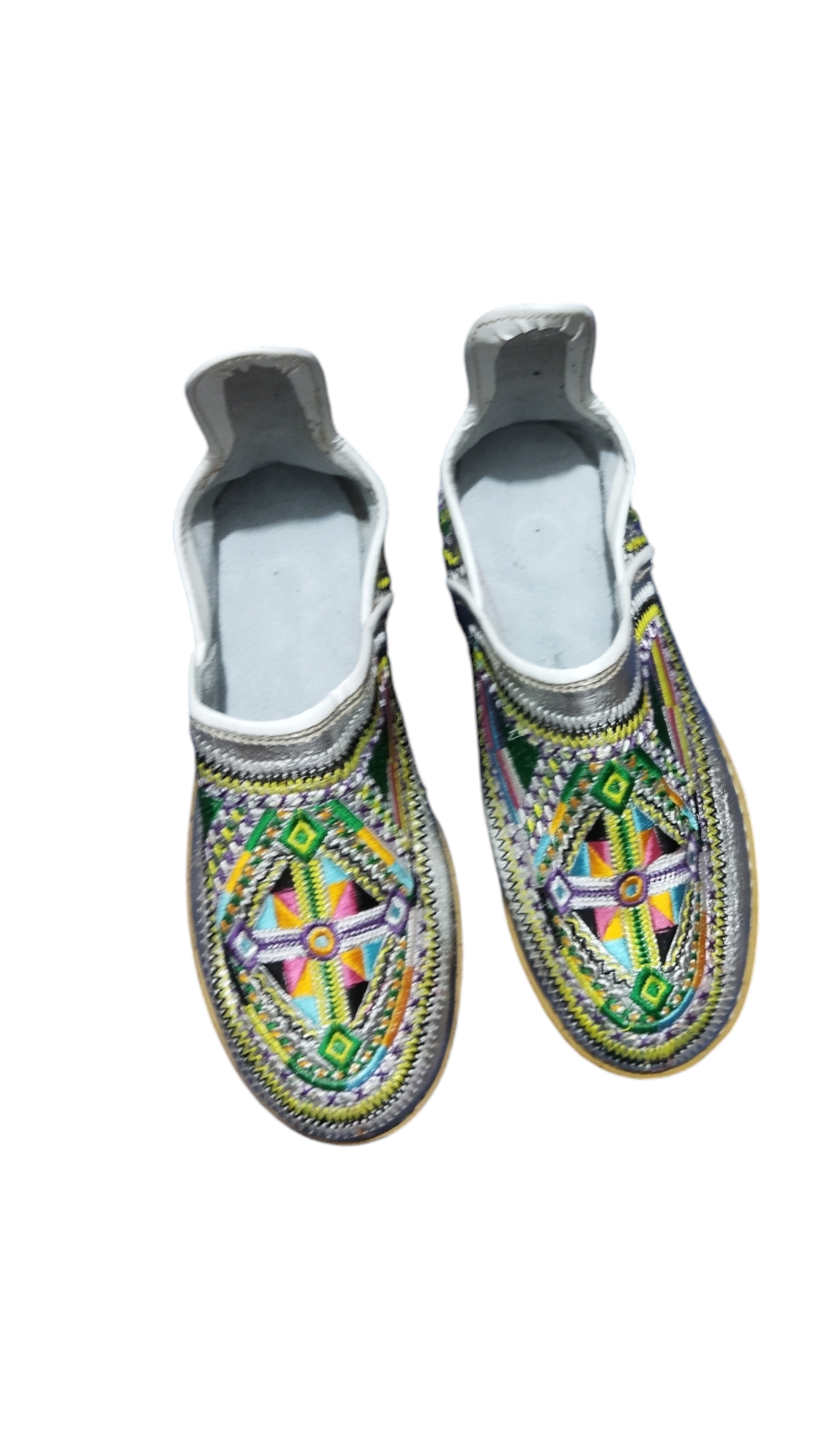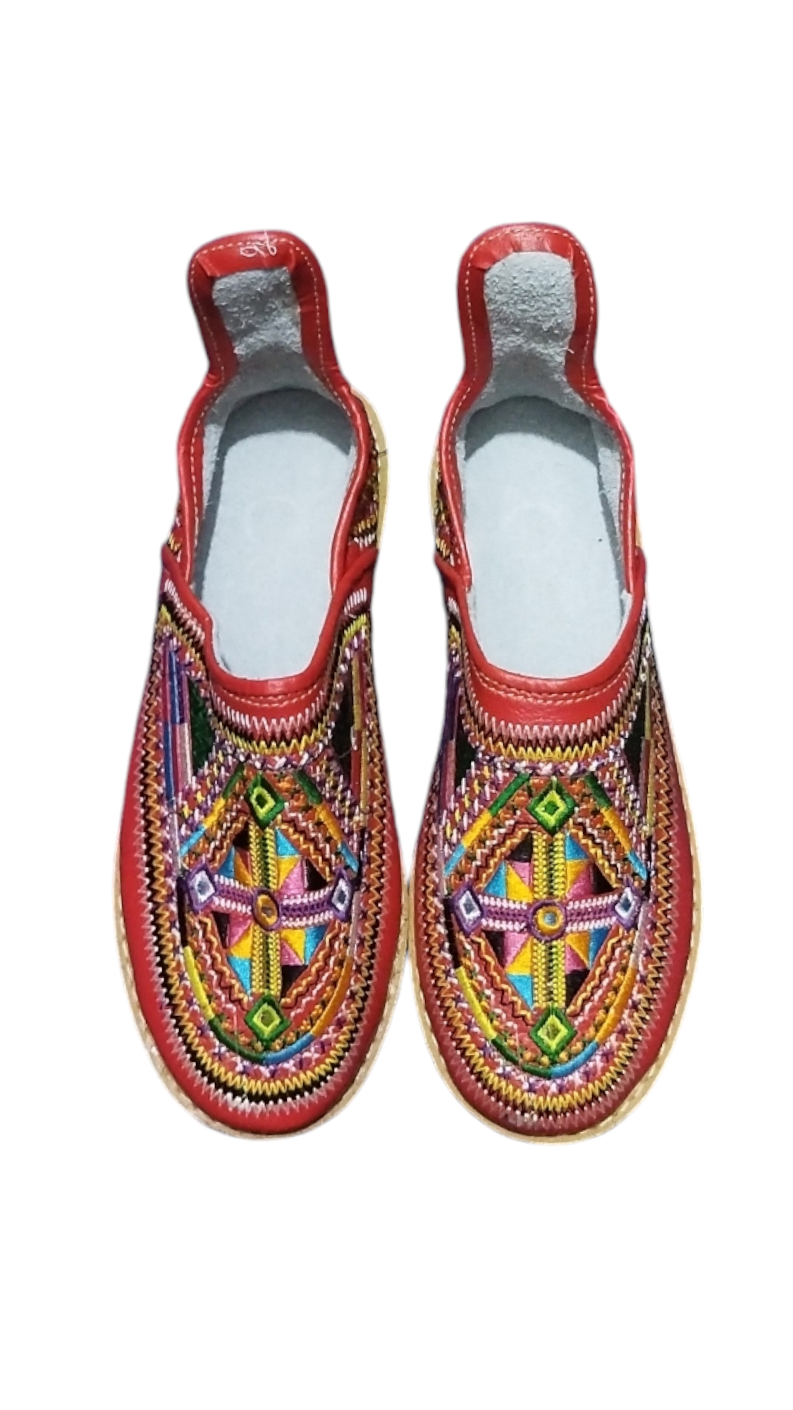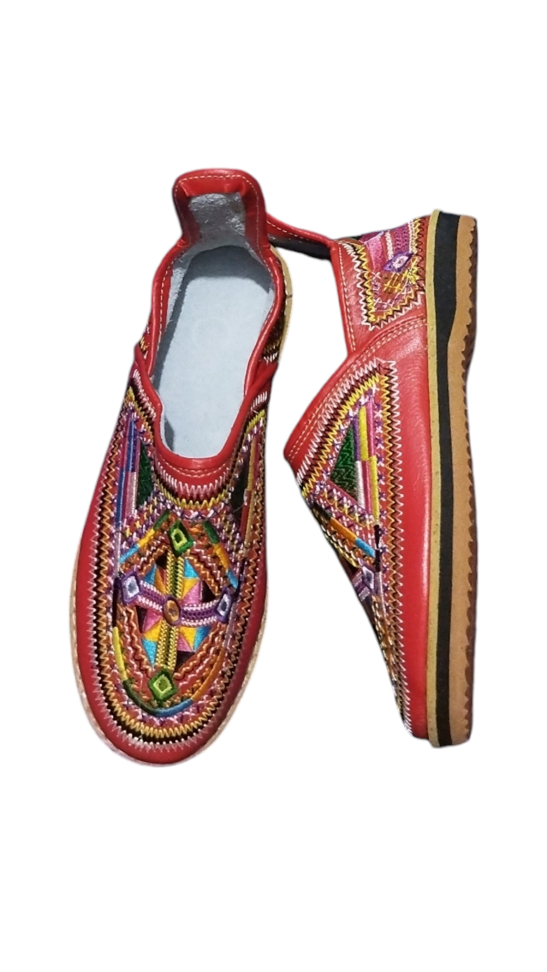 This product is a traditional handmade leather shoe, featuring a bright and colorful design, with delicate embroidery that reflects the cultural heritage. The shoe combines comfort and elegance, thanks to its modern and comfortable design, with a rubber sole that provides stability and durability. This shoe is an ideal choice for those looking to add a traditional and authentic touch to their daily look or special occasions.