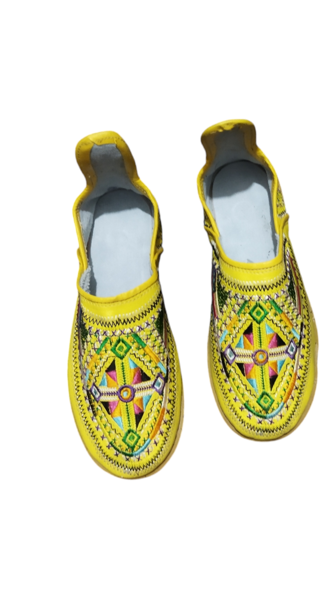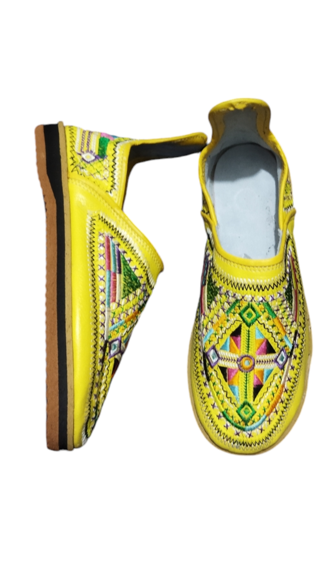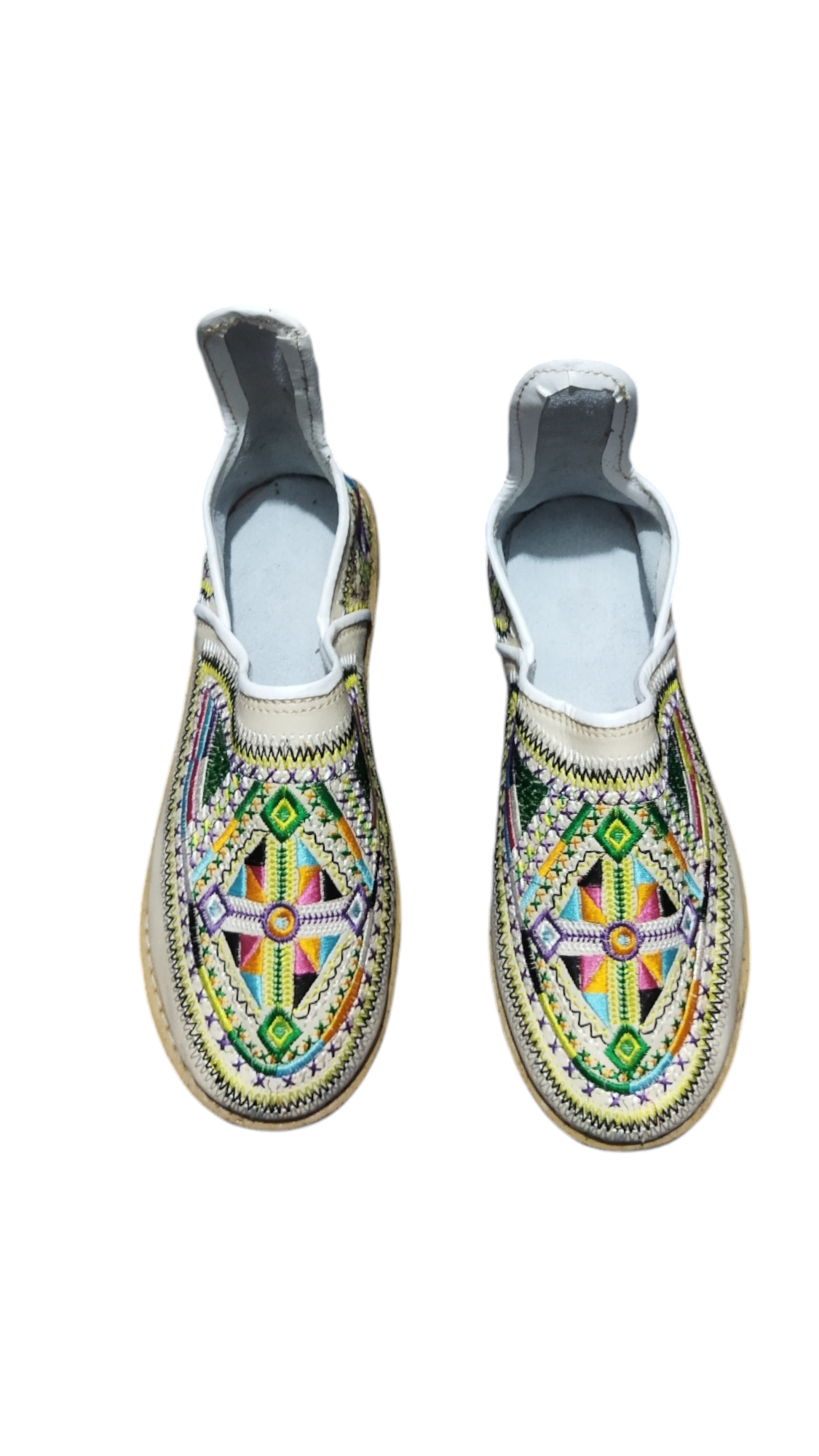 This product is a traditional handmade leather shoe, featuring a bright and colorful design, with delicate embroidery that reflects the cultural heritage. The shoe combines comfort and elegance, thanks to its modern and comfortable design, with a rubber sole that provides stability and durability. This shoe is an ideal choice for those looking to add a traditional and authentic touch to their daily look or special occasions.