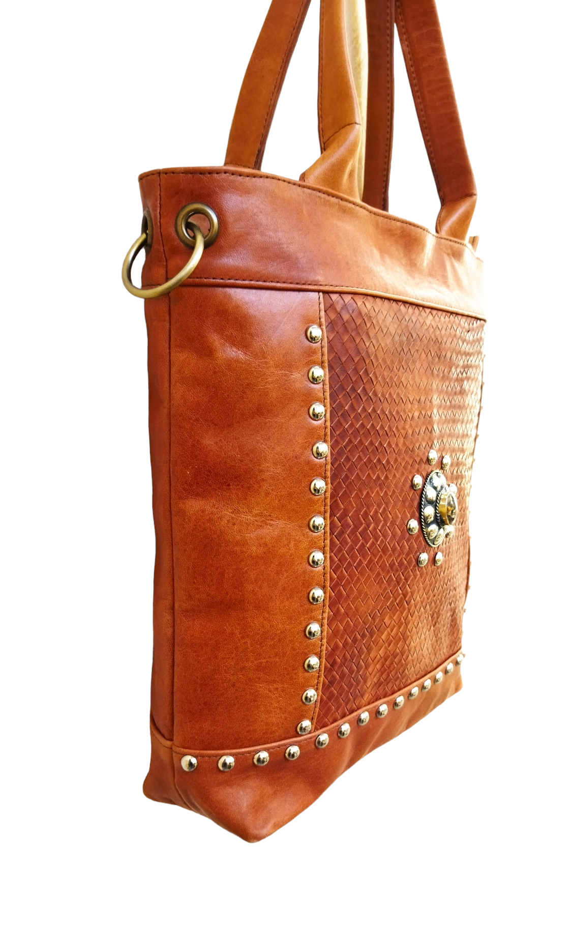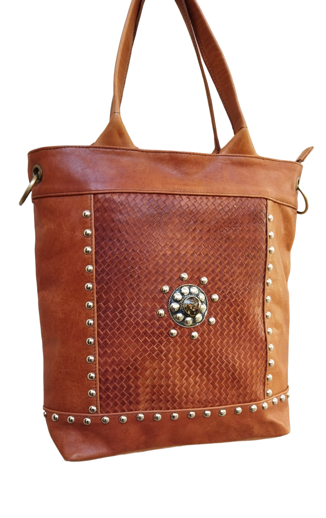 Design: It has a front decorated with shiny metal stud details, with a central flower or metal circle design decorated.