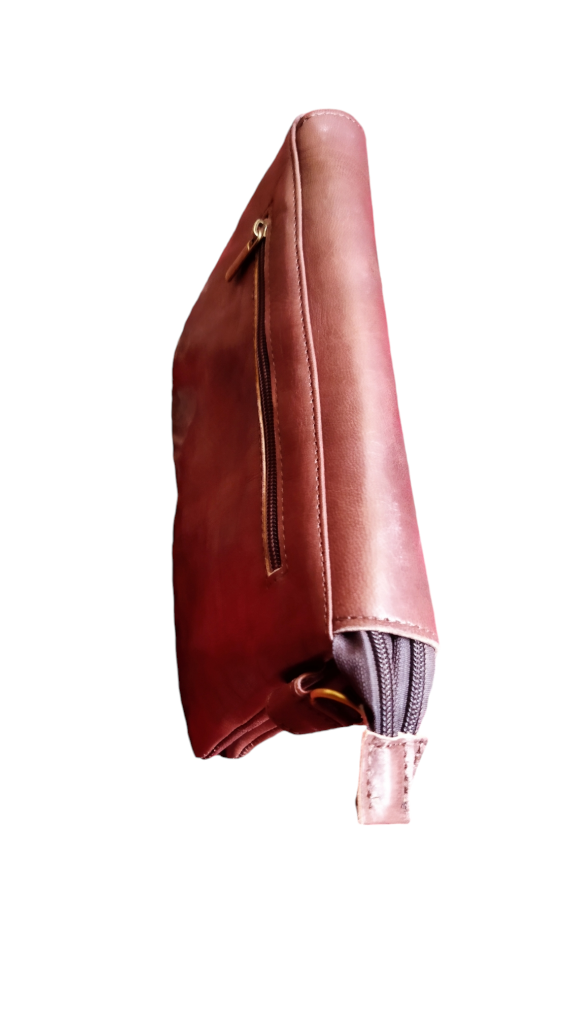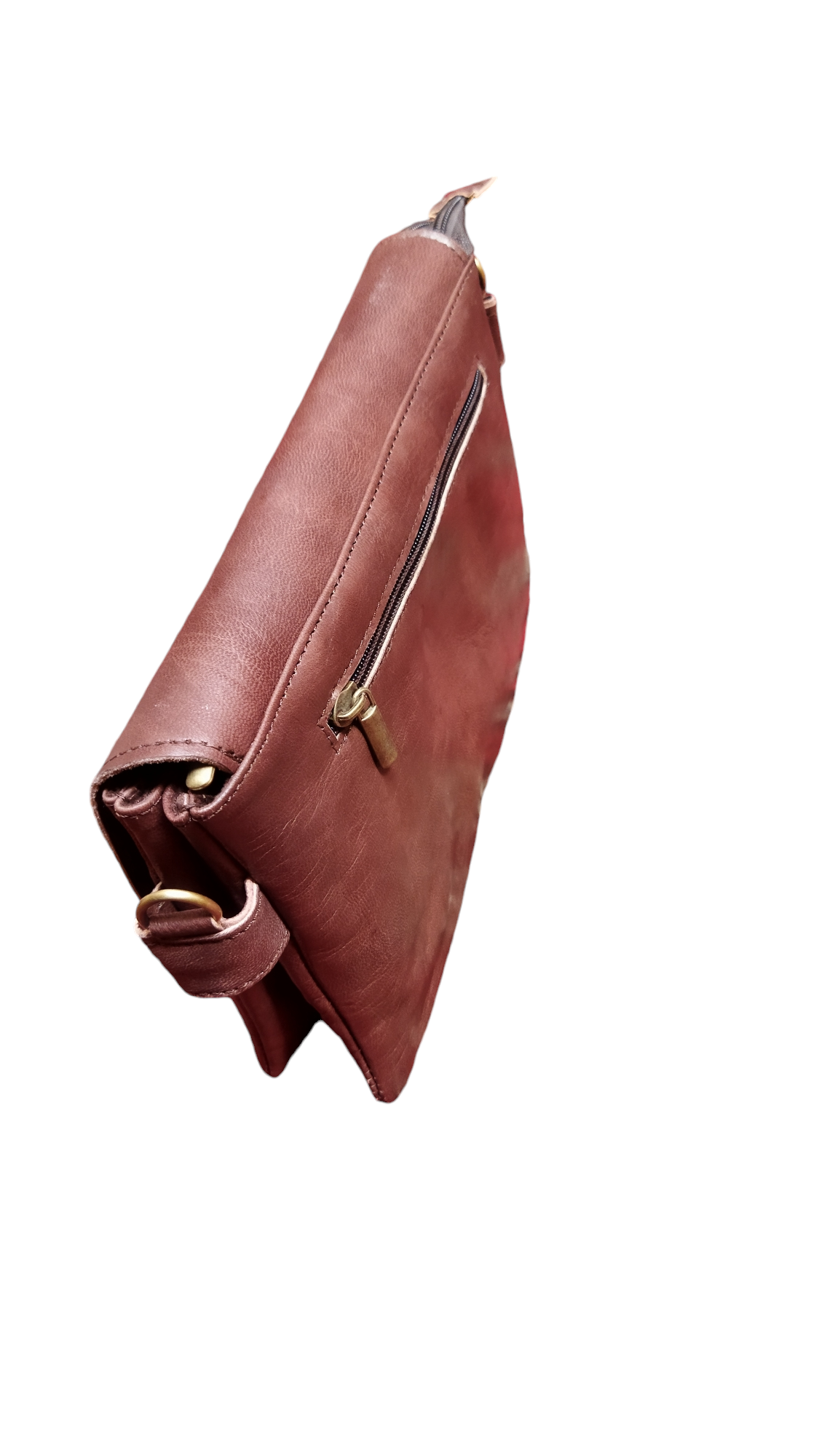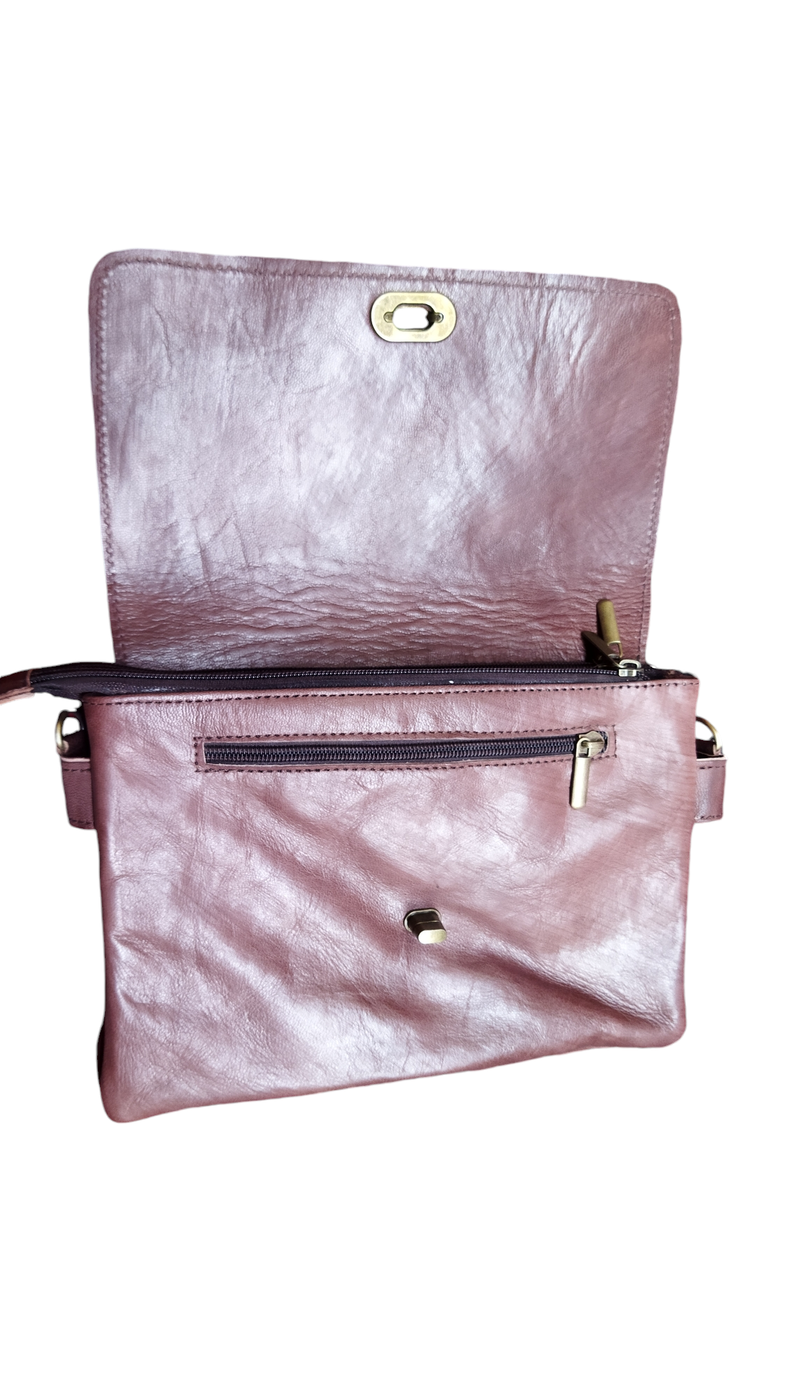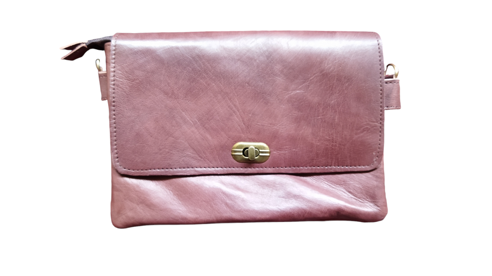 A handmade leather crossbody/shoulder bag in a classic brown tone, featuring a rectangular flap with an elegant twist-lock closure. The adjustable shoulder strap ensures comfortable wear, while the slim interior keeps your essentials neatly organized—phone, wallet, and keys.
