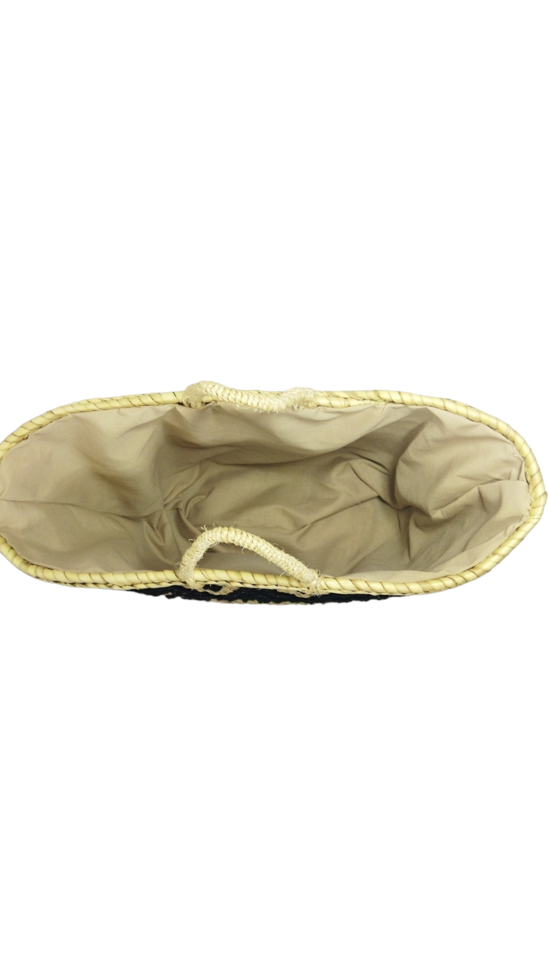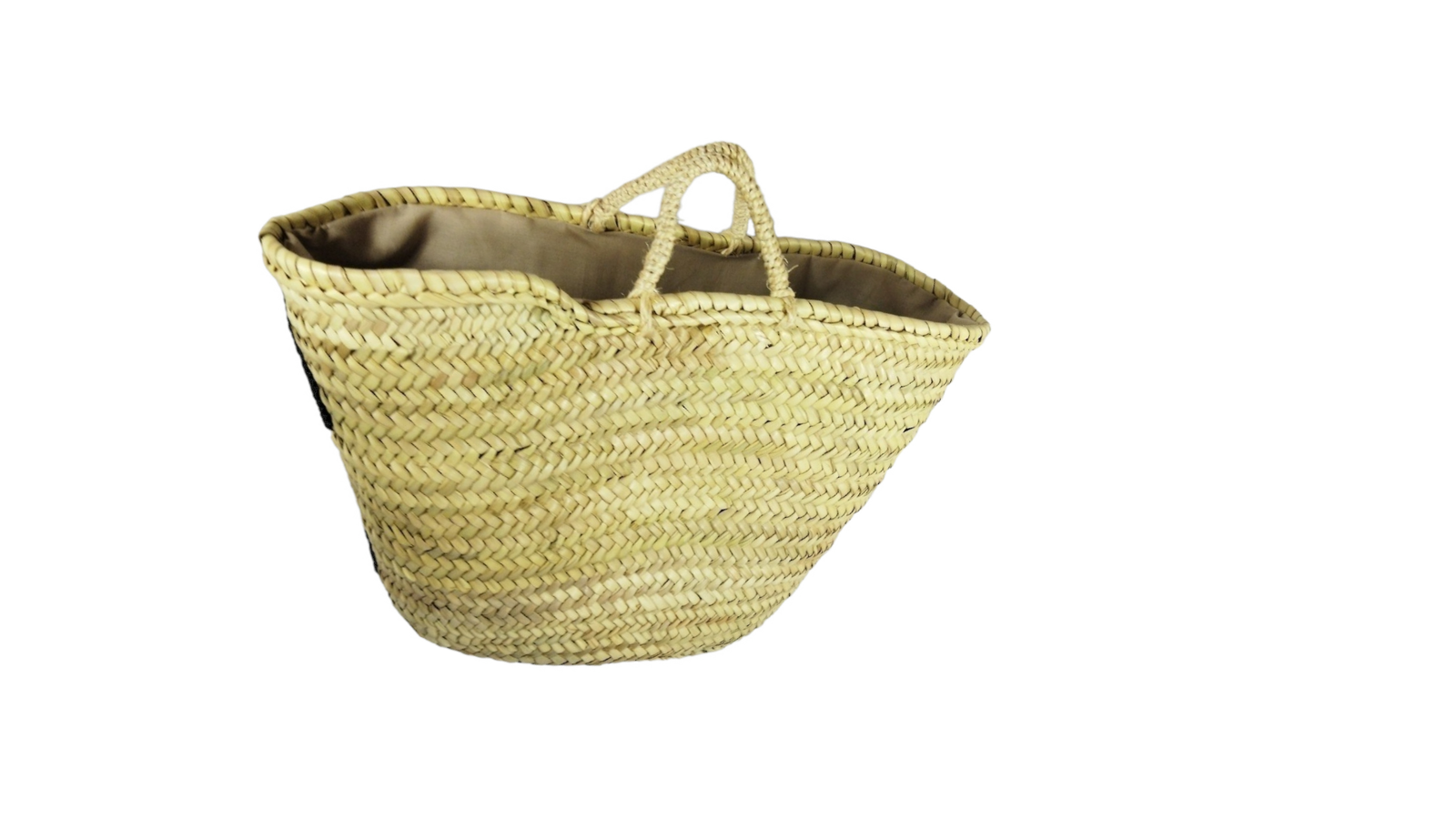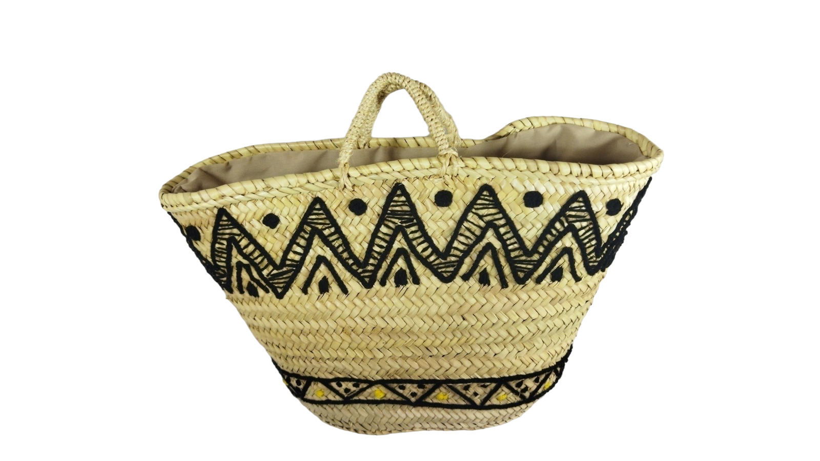 Handmade straw basket with decorative design. The basket is decorated with black geometric patterns covering the top, with zigzag lines and triangular shapes, giving it a traditional and artistic touch. The design looks simple and harmonious.