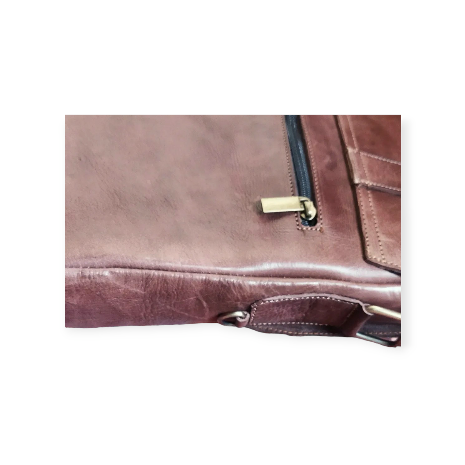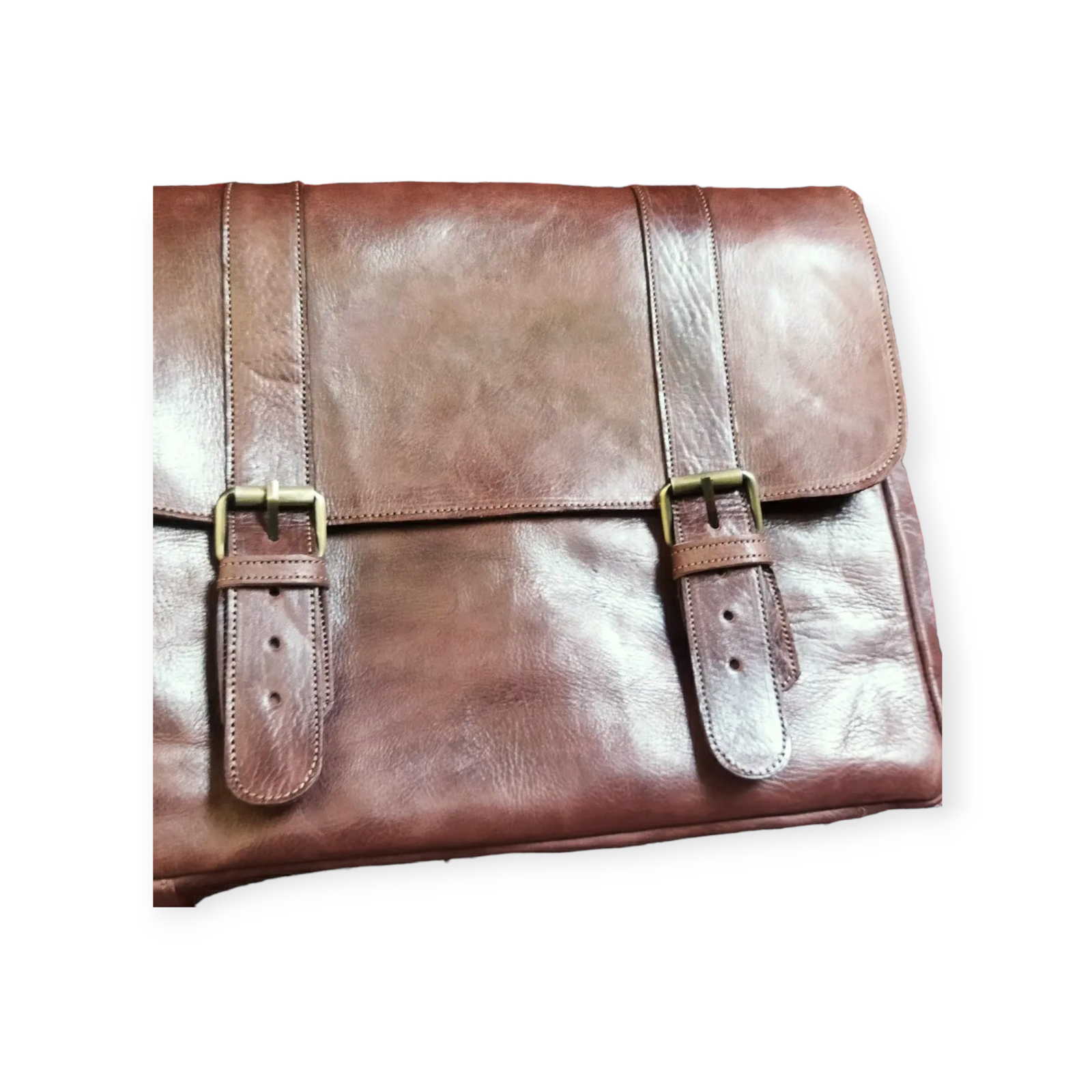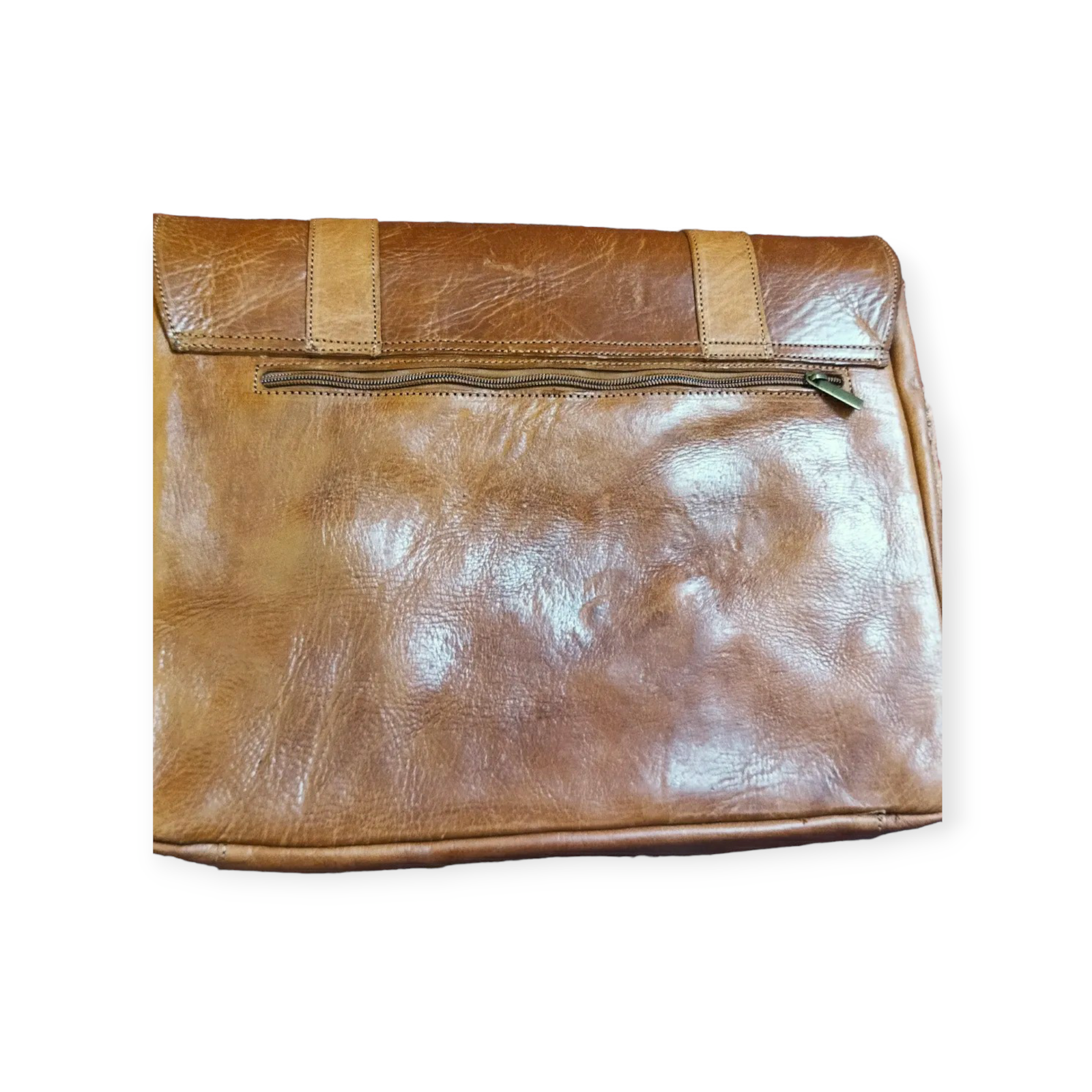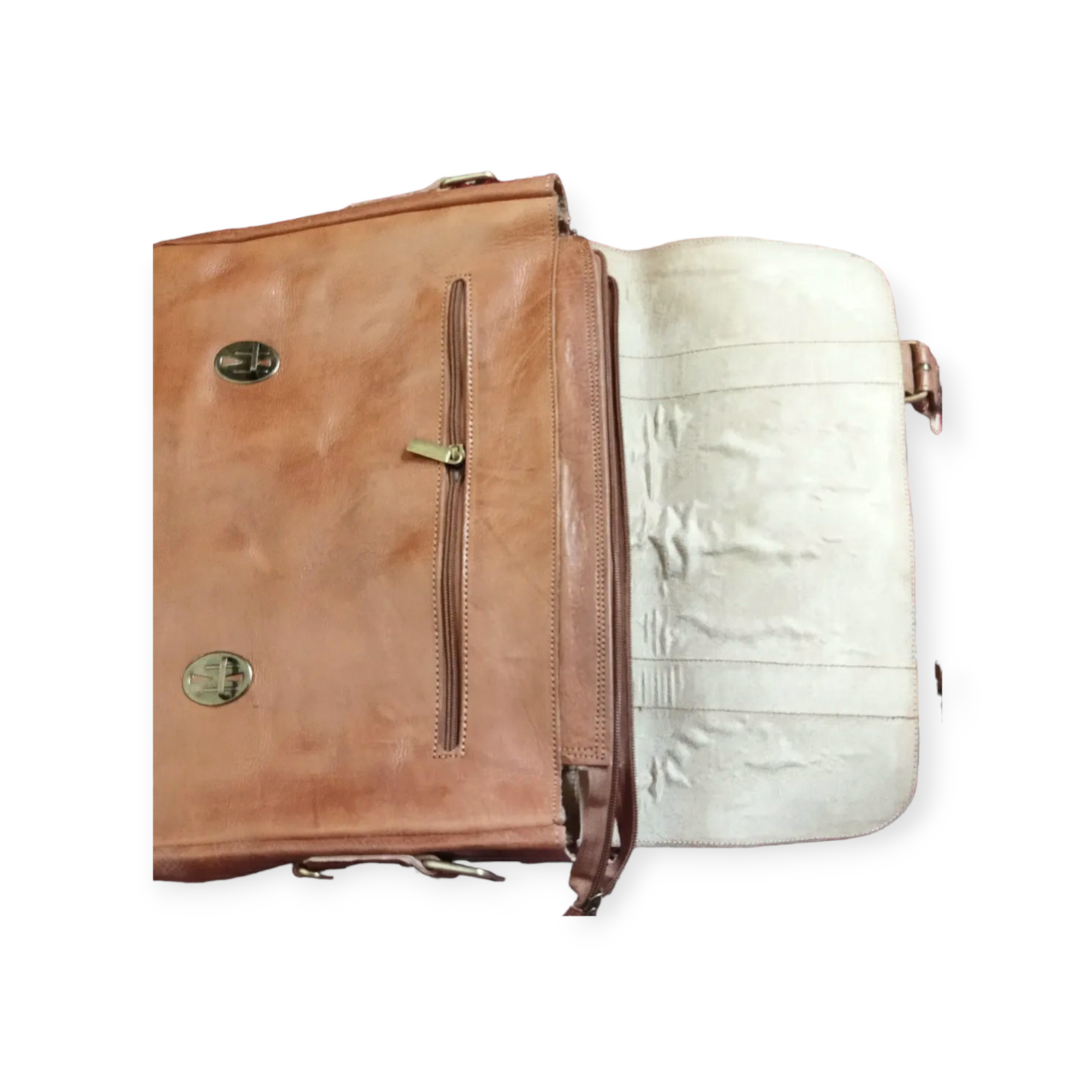This product is a bag made of natural leather in light brown color, featuring a classic and elegant design. The bag has a front cover that closes with two silver metal clasps, which adds an aesthetic touch to the design. The bag is designed to be practical and suitable for daily use, whether for carrying papers or small electronic devices.