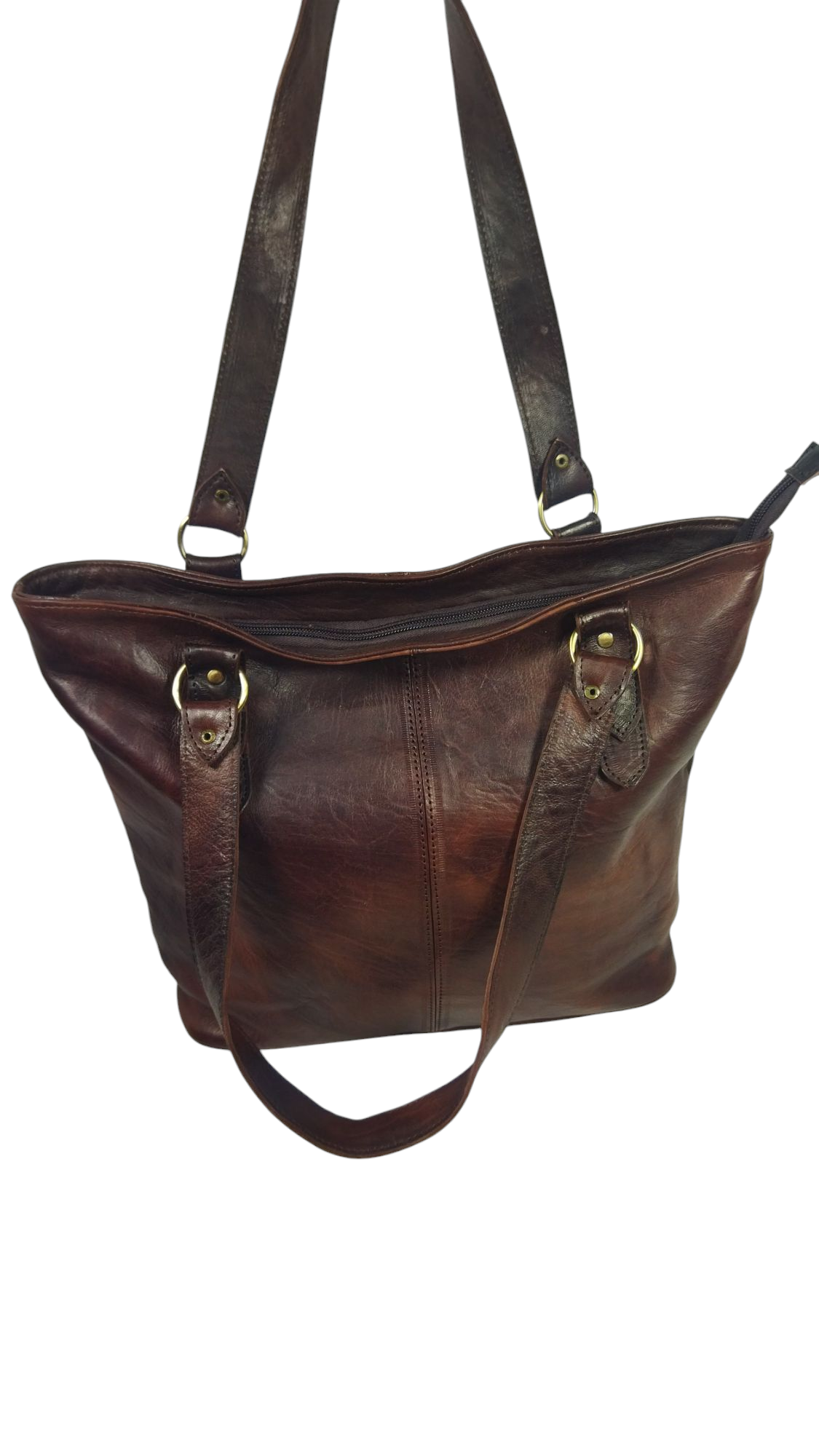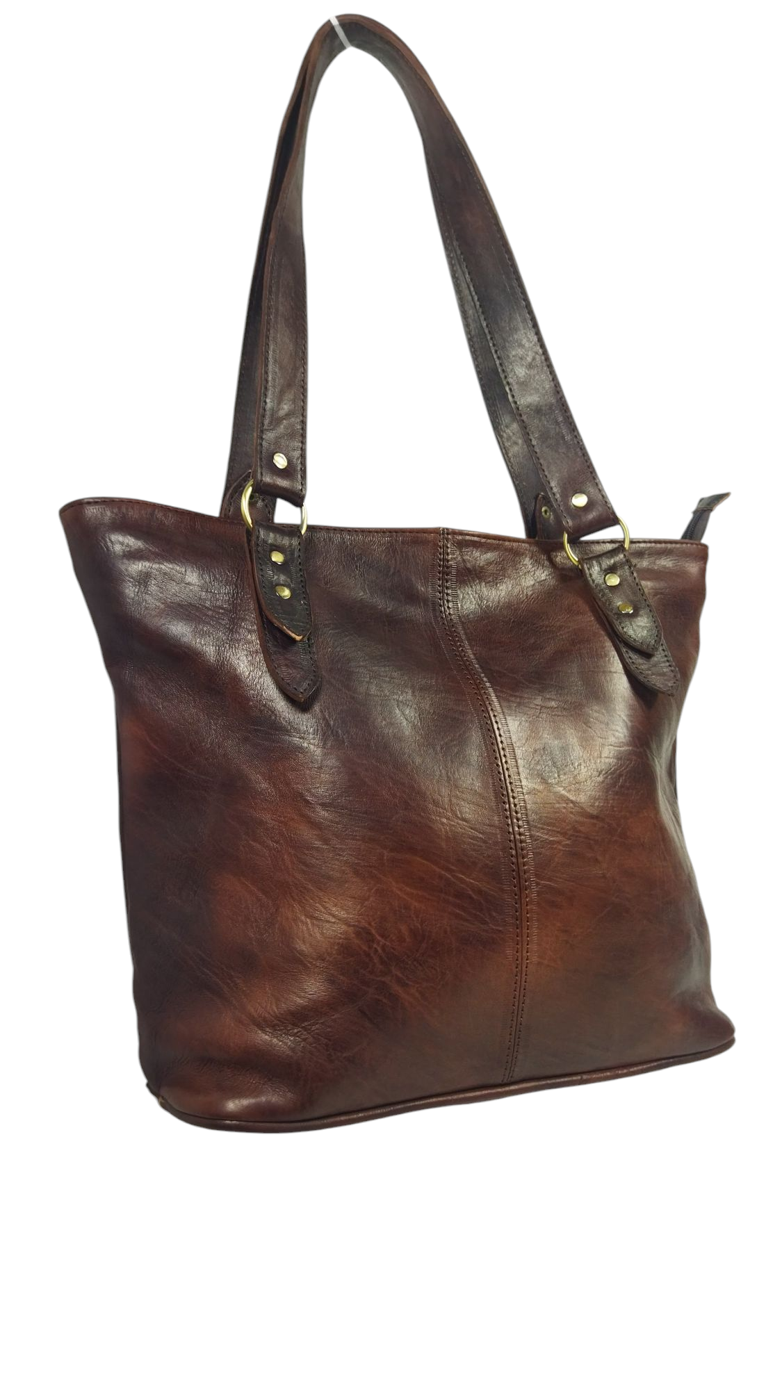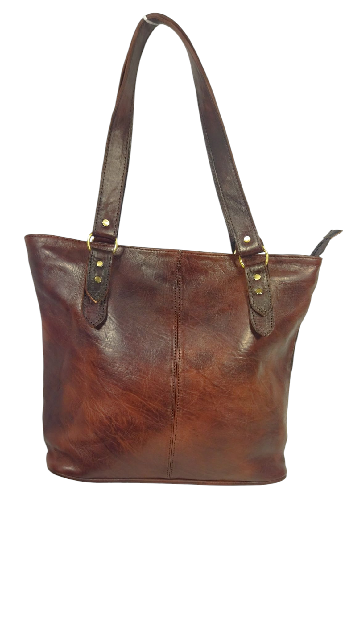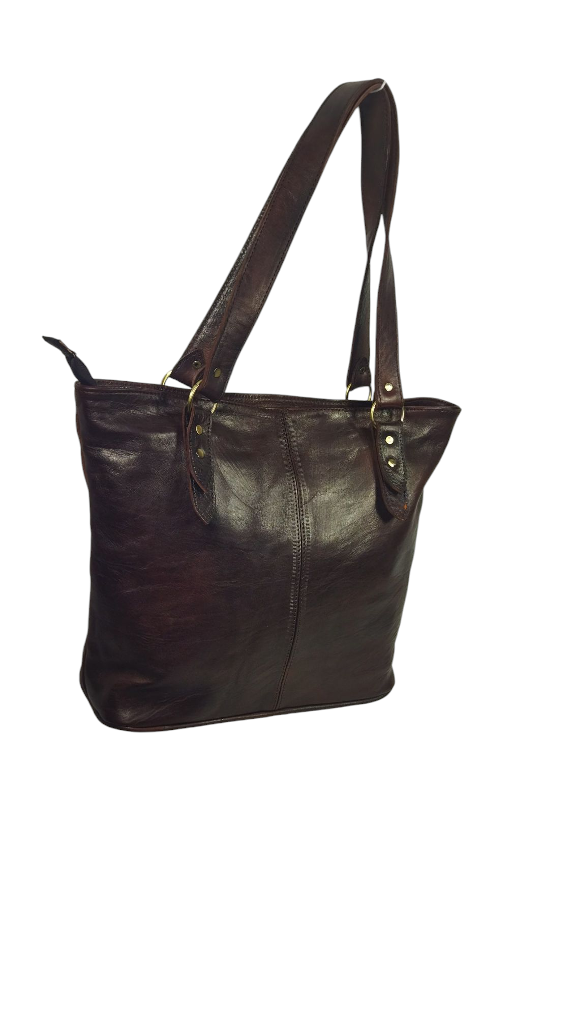 An elegant leather bag crafted from genuine leather in classic brown, featuring a natural sheen that highlights the quality and softness of the leather. Its design is practical and simple with a modern touch, with a vertical center stitching that adds a sleek, coordinated look.